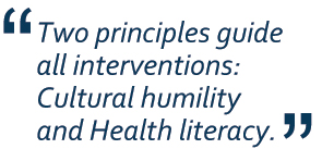 Two principles guide all interventions: Cultural humility and Health literacy.