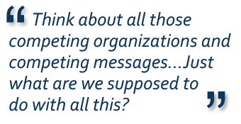 Think about all those competing organizations and competing messages every not-for-profit, for profit, government and local health department is trying to distinguish itself, send out branded health messages'for example, Take 10,000 steps' or 'No more food nutrition pyramid! Now we have a plate!'