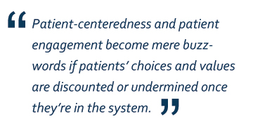 Mettler: Navigating the system. Or rather, navigating our non-system. We don't make it easy for people to a) get health care, b) go through it without harm, and c) benefit from it. There's lots of talk about patient-centered medical homes and Accountable Care Organizations, but what do those look like and how are they going to affect me, the health care consumer? I can only hope they lead to a more rational system, and one that's easier to engage with. Patient-centeredness and patient engagement become mere buzzwords if patients' choices and values are discounted or undermined once they're in the system.' '