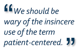 First, we should be wary of the insincere use of the term patient-centered and the failure to fully enjoin patients as co-designers of the research agenda and studies. This includes the failure to provide training for patients in biomedical study terms, terminology, and statistics to be able to participate meaningfully.