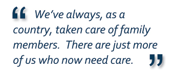 Gail Hunt: The number of family caregivers has gone from 21 percent of the US population serving in that role in 2004 to 23 percent in 2009.' This increase reflects a combination of increased longevity and the aging of the Baby Boomers. We've always, as a country, taken care of family members.' There are just more of us who now need care.