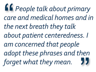These days, people talk about primary care and medical homes and in the next breath they talk about patient centeredness. I am concerned that people adopt these phrases and then forget what they mean.