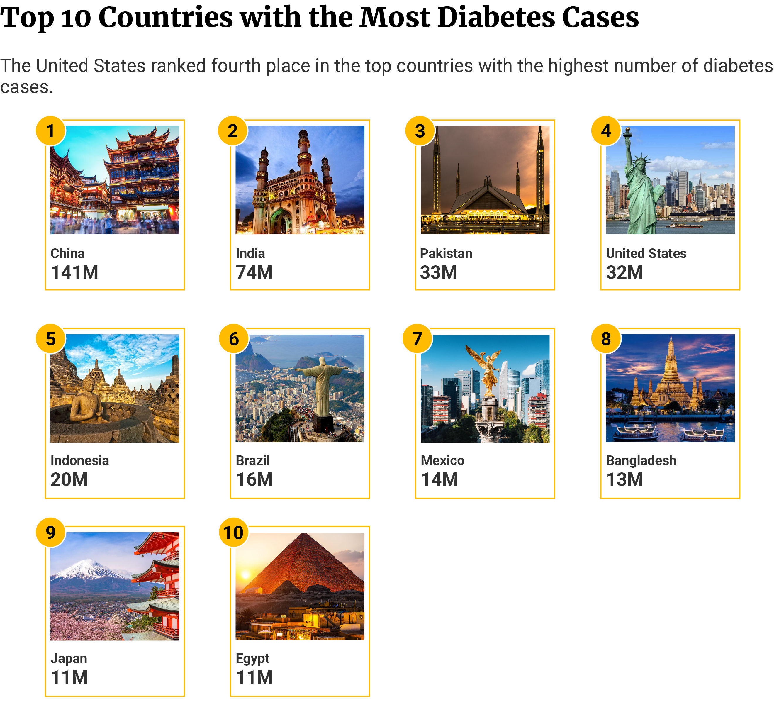 • Type 2 diabetes makes up 90.9% or 21 million of all diabetes cases in the country [4].